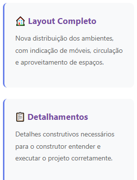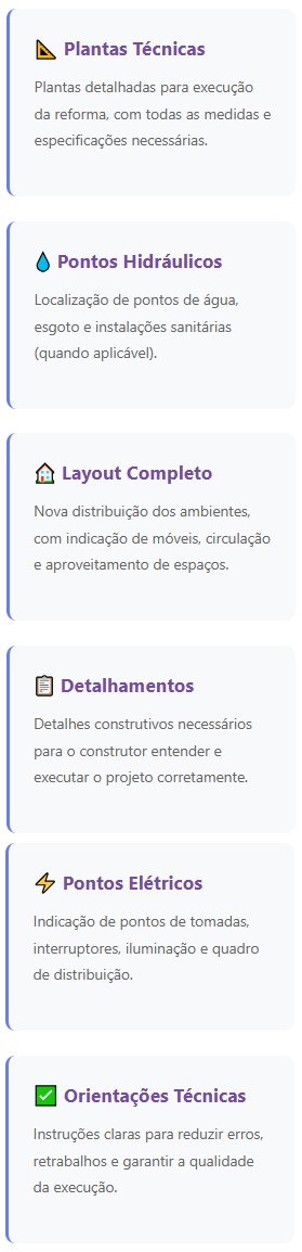 Entregamos exatamente o que você precisa para executar a reforma: um projeto executivo completo, claro e pronto para uso.