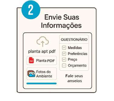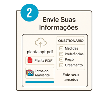 Após confirmar a compra enviaremos um link e ou e-mail para você encaminhar a planta baixa do seu imóvel, fotos de todos os ambientes e preenchimento do formulário completo.