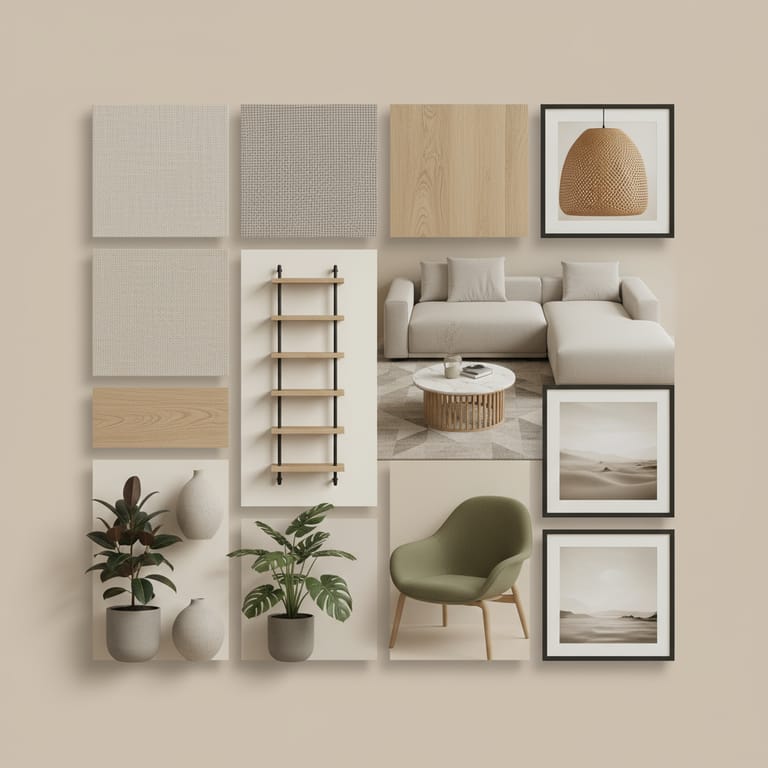 Painel de estilo (moodboard) com referências de cores, materiais e acabamentos