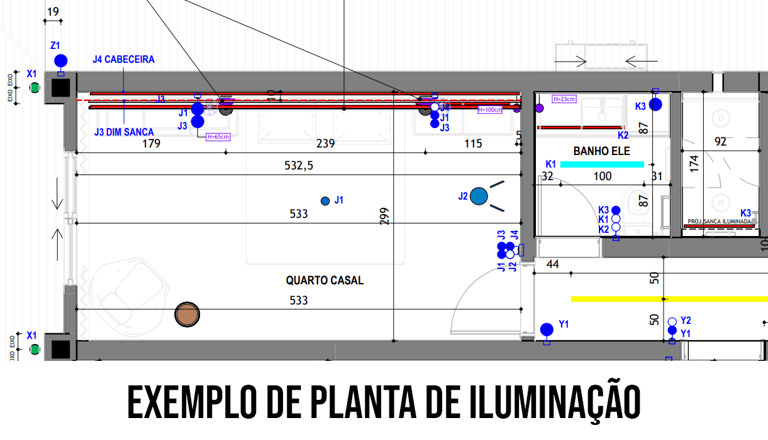Planta de iluminação mostrando tomadas, interruptores e pontos de luz e indicação de luminárias